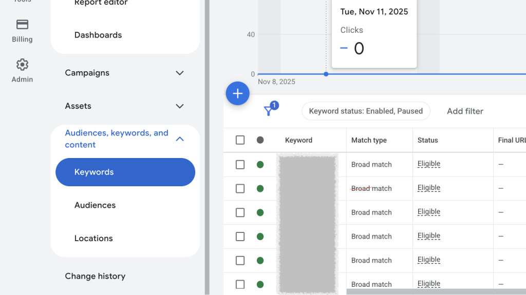 برای هزینه، بودجه و گزارش به مدیریت → همیشه به تب Keywords نگاه کن